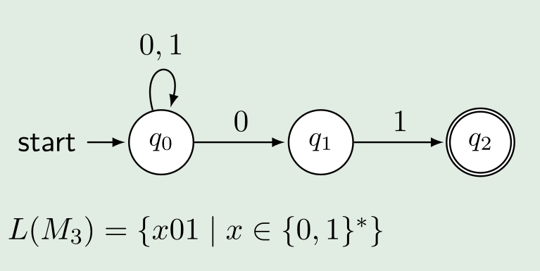 - Für jeden Zustand einen Ausdruck aufschreiben: $$ \begin{align} L_{q_0}&=(0|1)L_{q_0}|0L_{q_1}\Rightarrow(0|1)^0L_{q_1}\Rightarrow(0|1)01\ L_{q_1}&=1L_{q_2} \Rightarrow1\varepsilon=1\ L_{q_2}&=\varepsilon\ \end{align} $$