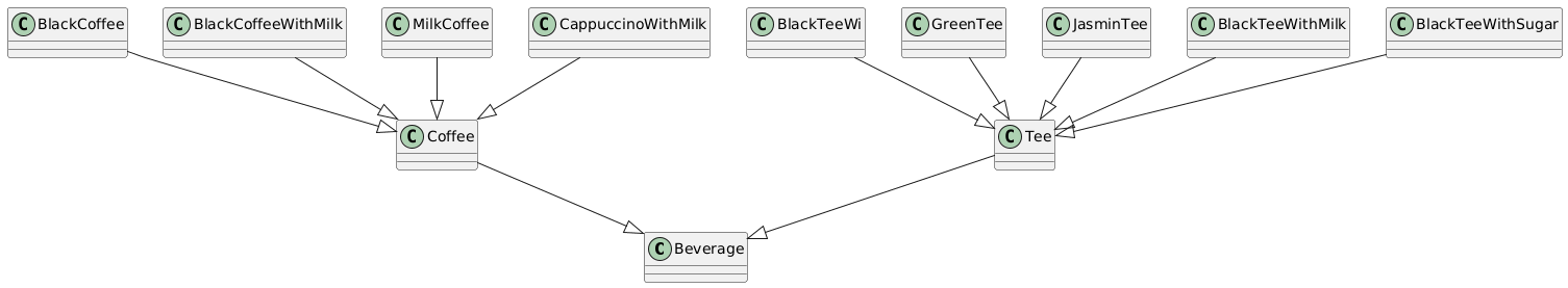The “-WithSugar” and “-WithMilk” class could be omitted by using inheritance but not every beverage has the option of milk or sugar (FruitTee or MilkCoffee comes to mind).